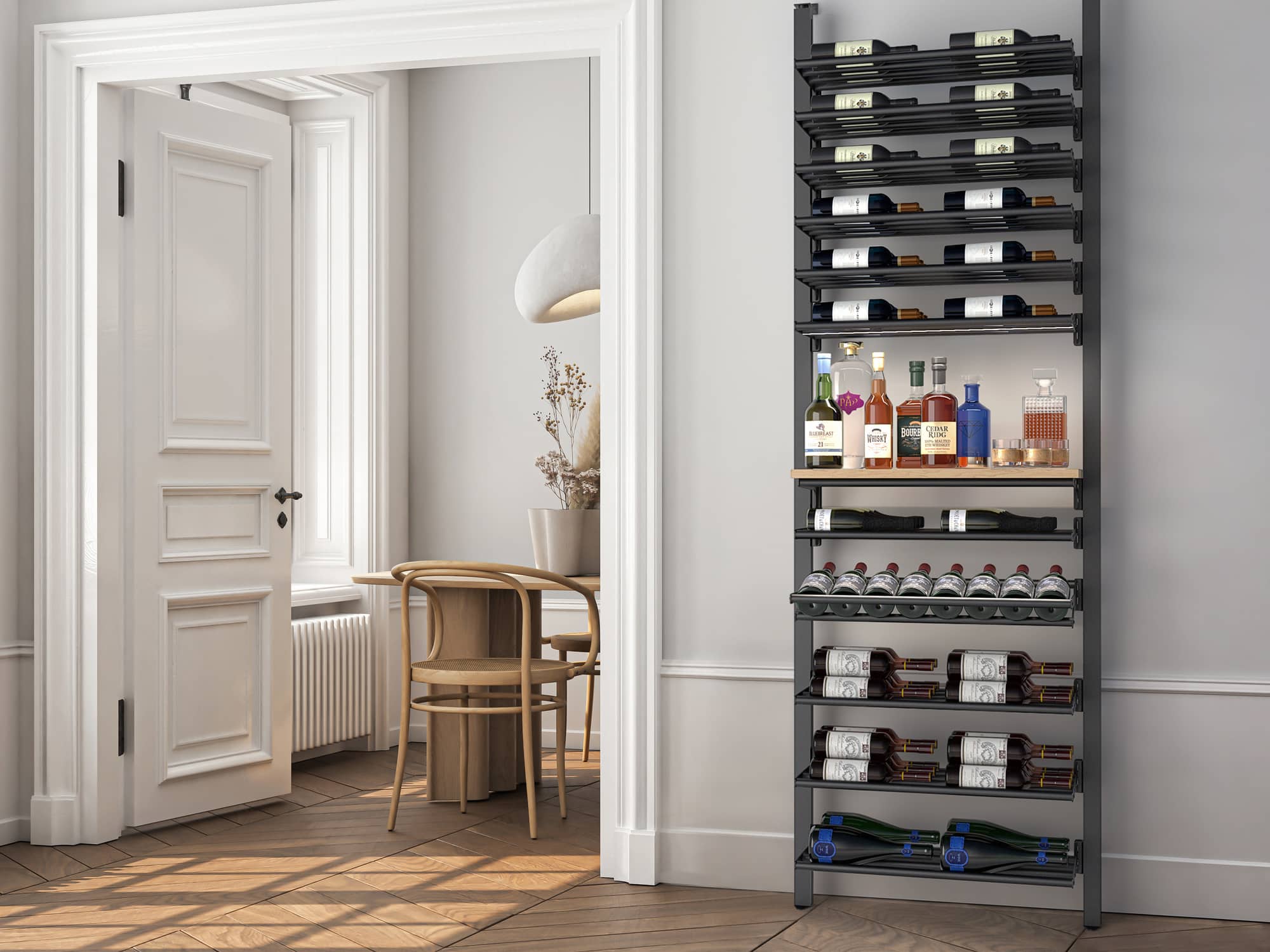Built in aluminum, the elegance of its clean lines perfectly matches its sturdiness. Offering impressive flexibility in bottle organization and presentation, it is ideal for cellars or glassed-in wine cellars, adapting equally well to small spaces and large layouts.